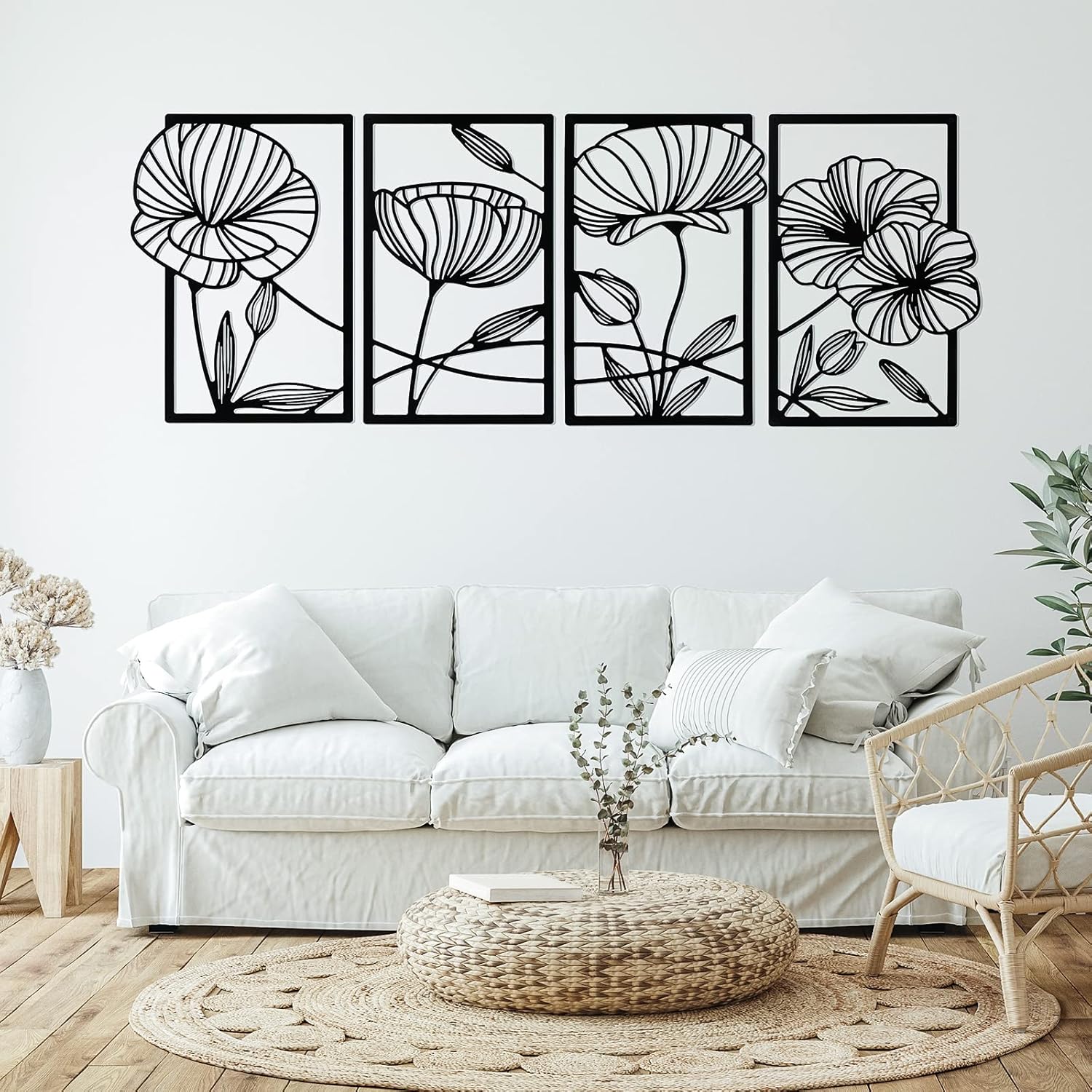 4 Pcs Black Metal Wall Art – Floral Line Art Minimalist Wall Decor